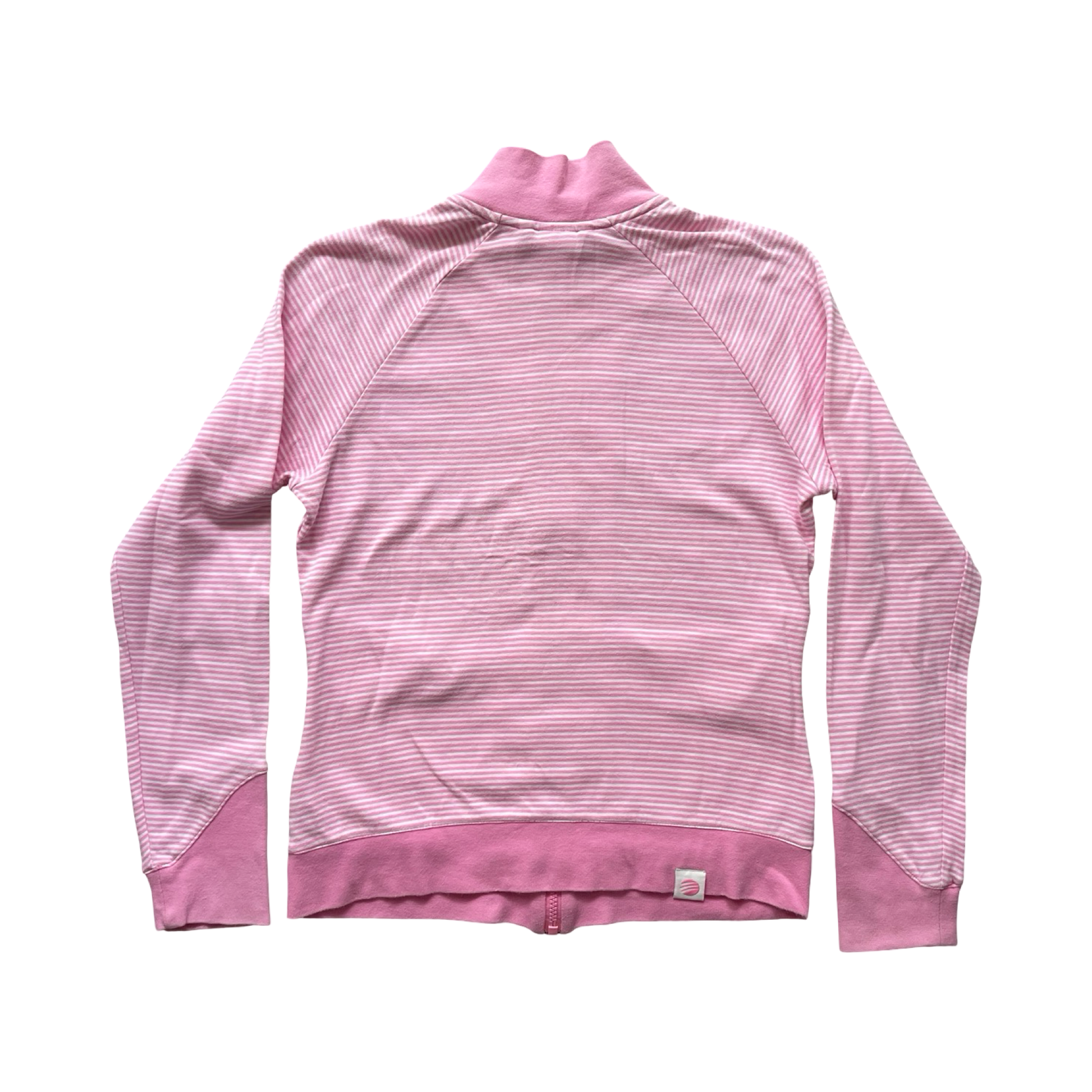 Adidas pink striped zip up, with long sleeves and asymmetric stripe pattern. It has a rubber adidas detail on the top right, and thick waistband and cuff details. Can fit XS-M depending on how tight/baggy you would like it.
