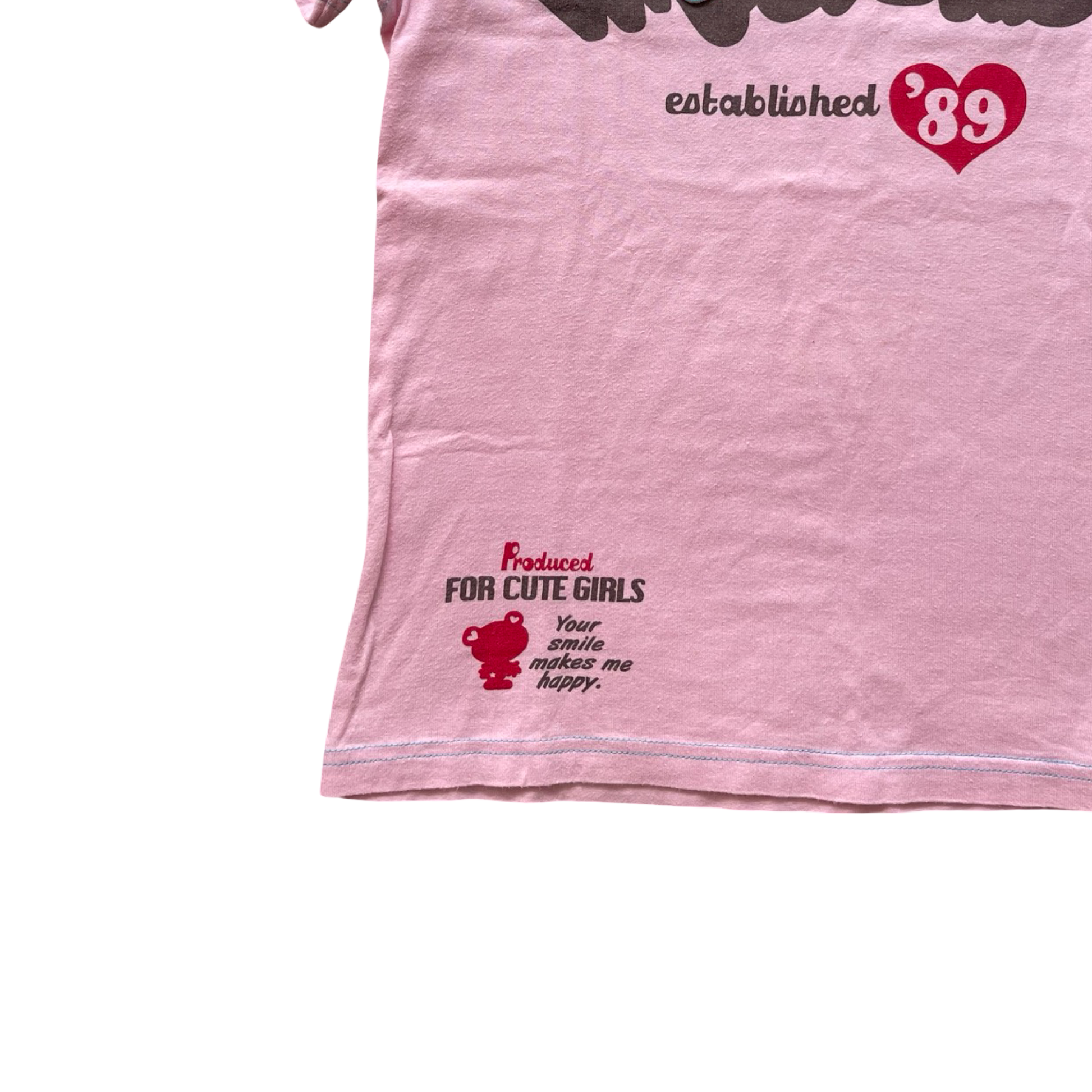 Angel Blue pink baby t shirt with embroidered Angel Blue and pink heart. Short sleeves with blue contrast stitching and graphic on the back.
