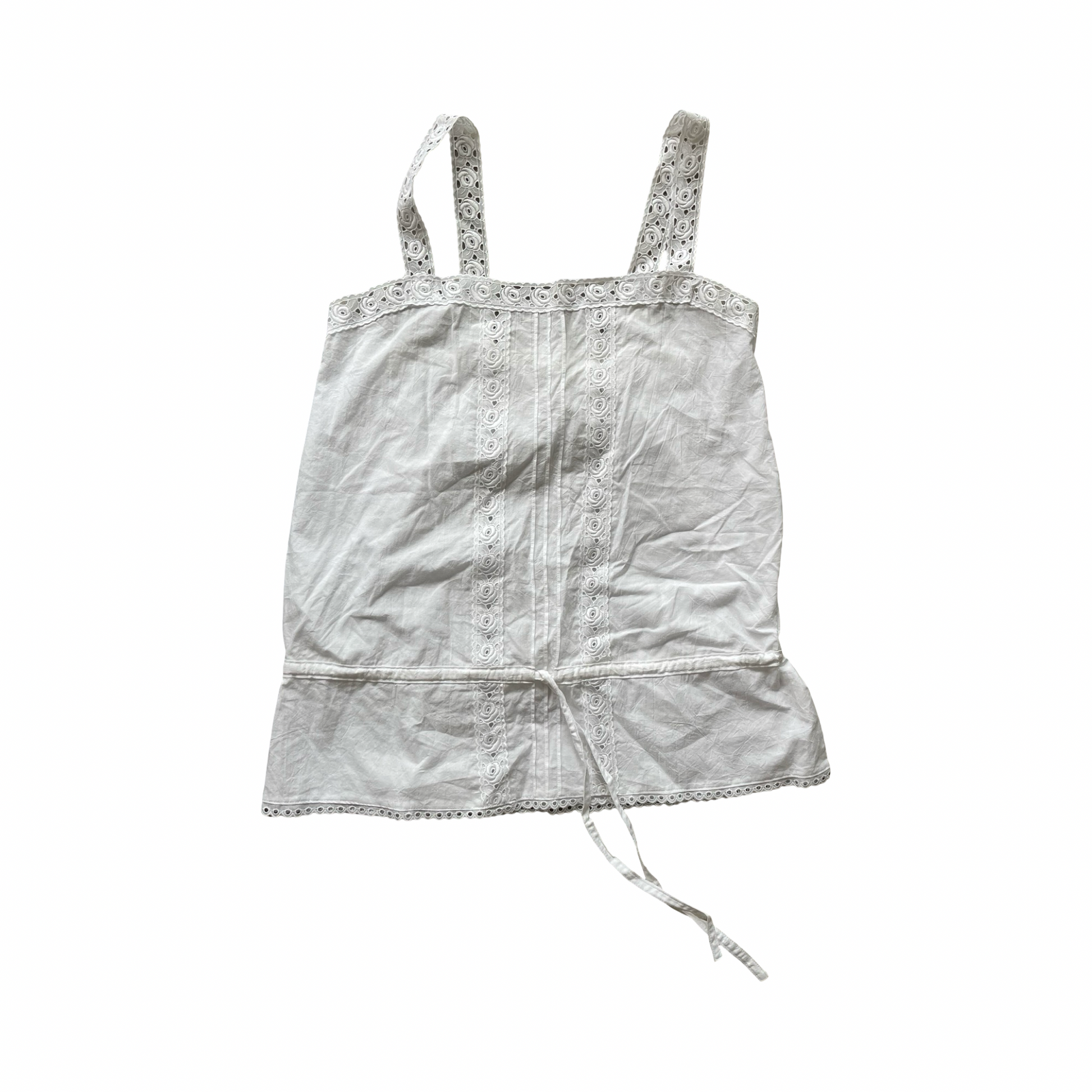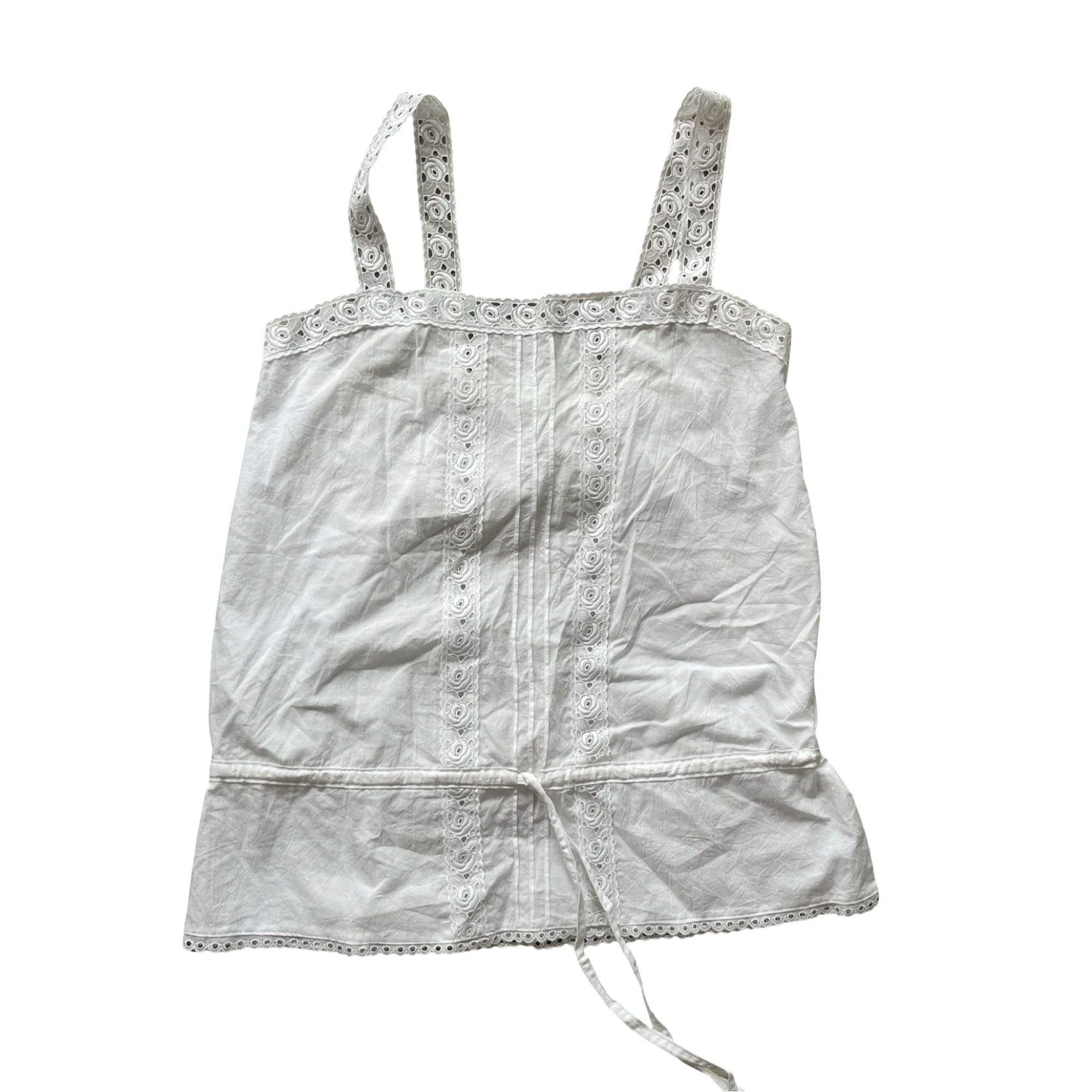 Broderie anglaise white babydoll cami with rose details. Tie up waistband, can be worn loose and tied in a bow or made tighter to adjust the shape of the cami. Stretchy gathered section at the back. Made from 100% cotton.