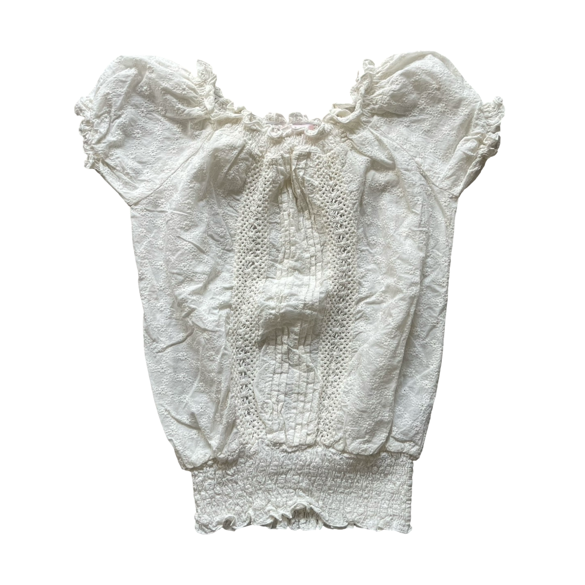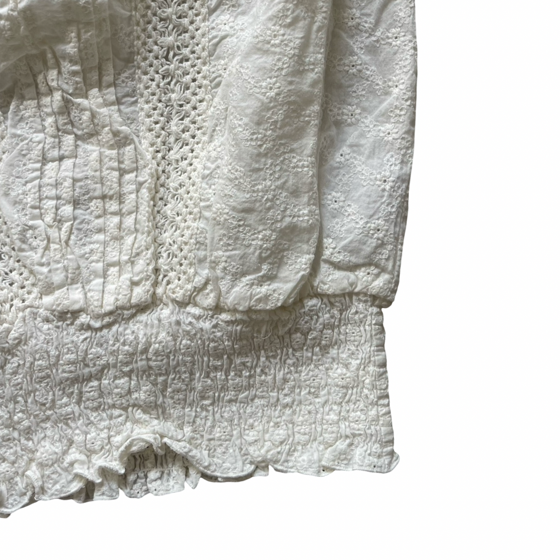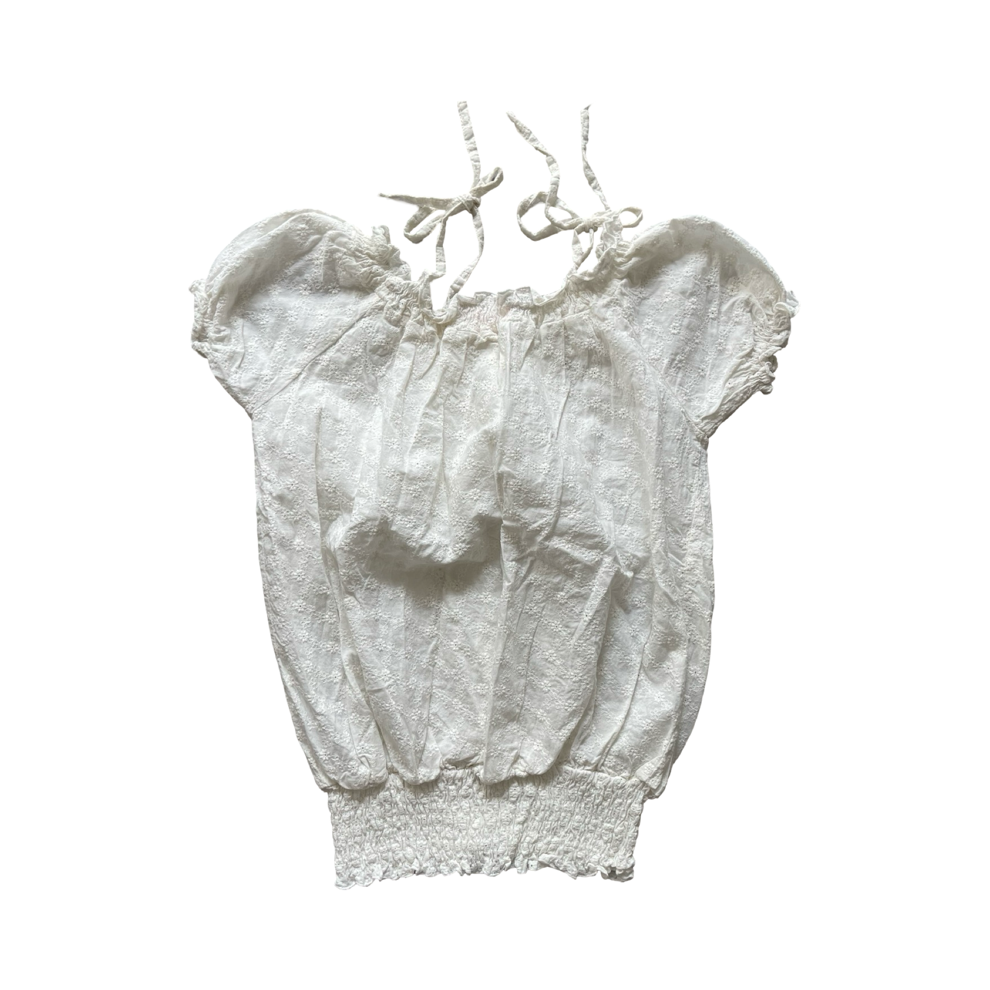 White broderie anglaise louse with puff sleeves, elasticated neckline and waistband, frill sleeves and tie up details at the top. Lace, floral pattern all over. Slouchy fit that cinches in at the waist.