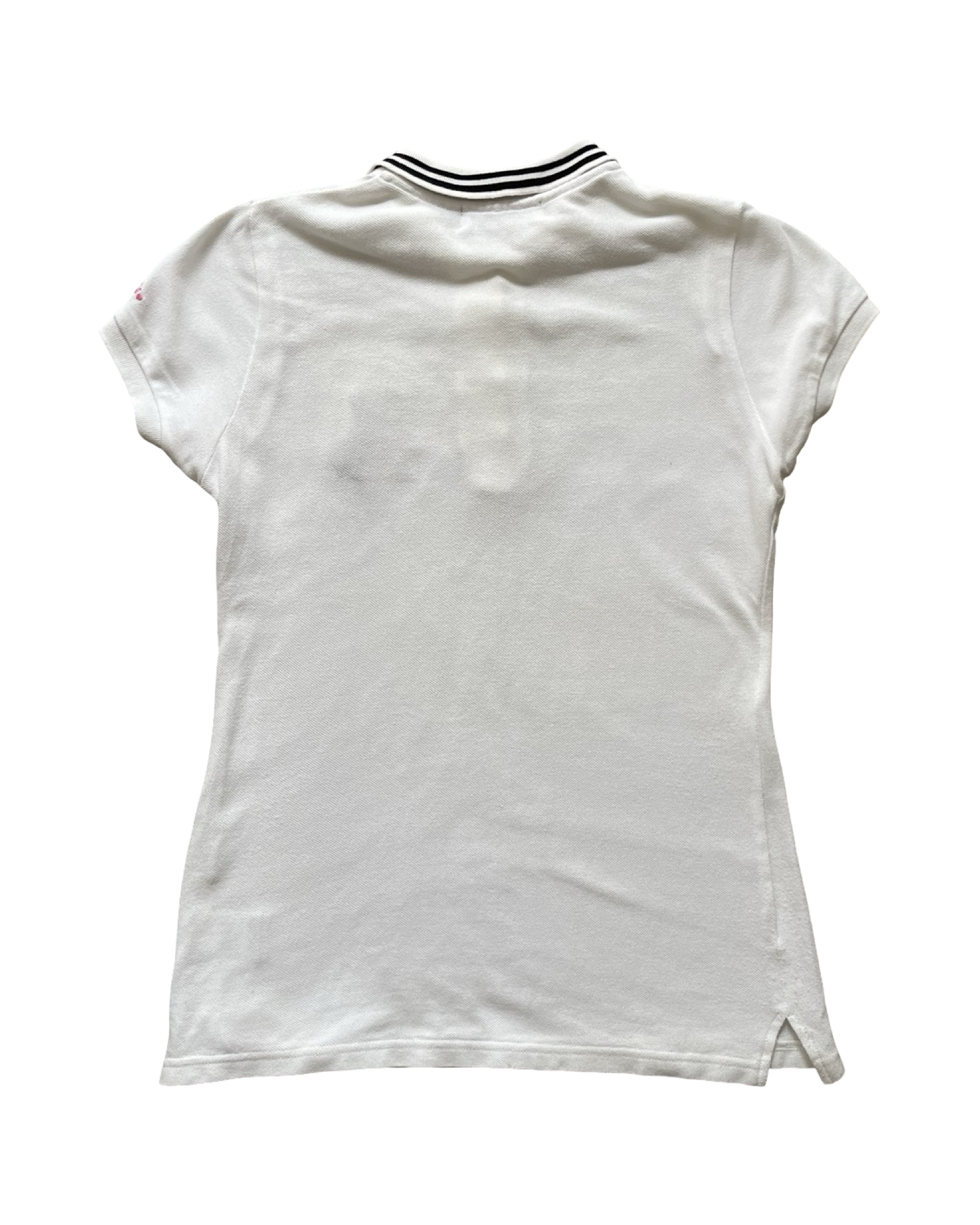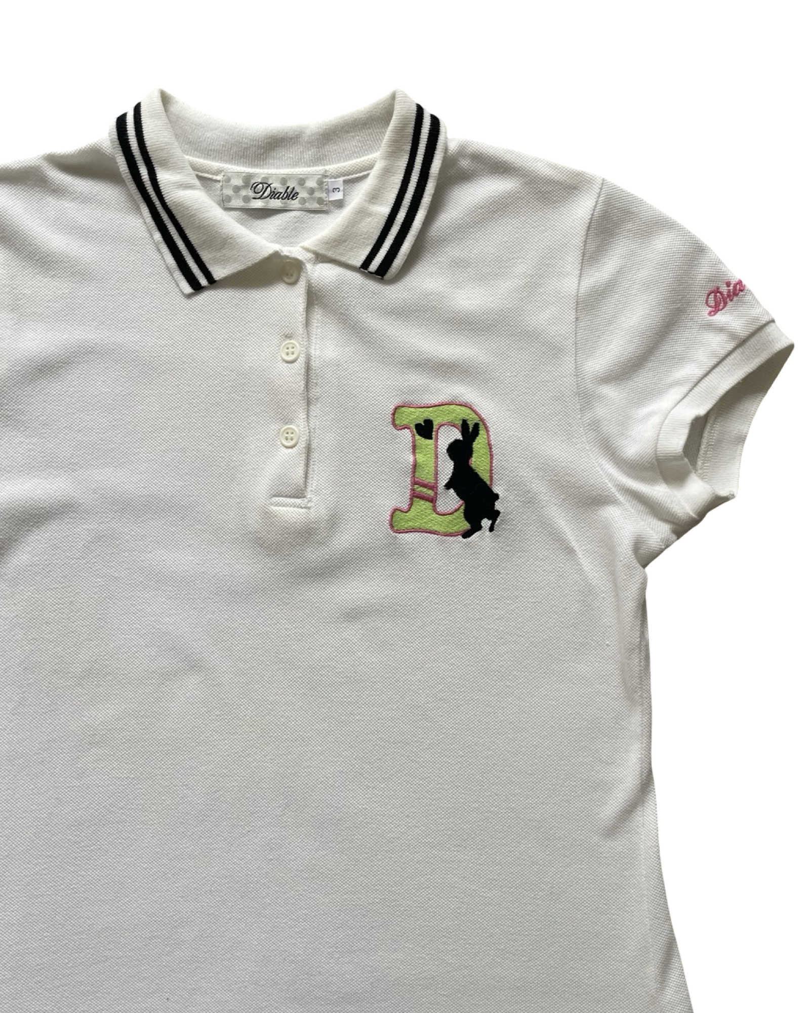 White short sleeve polo top with black stripe detail on the collar. "D" initial in pink and green and bunny shadow.