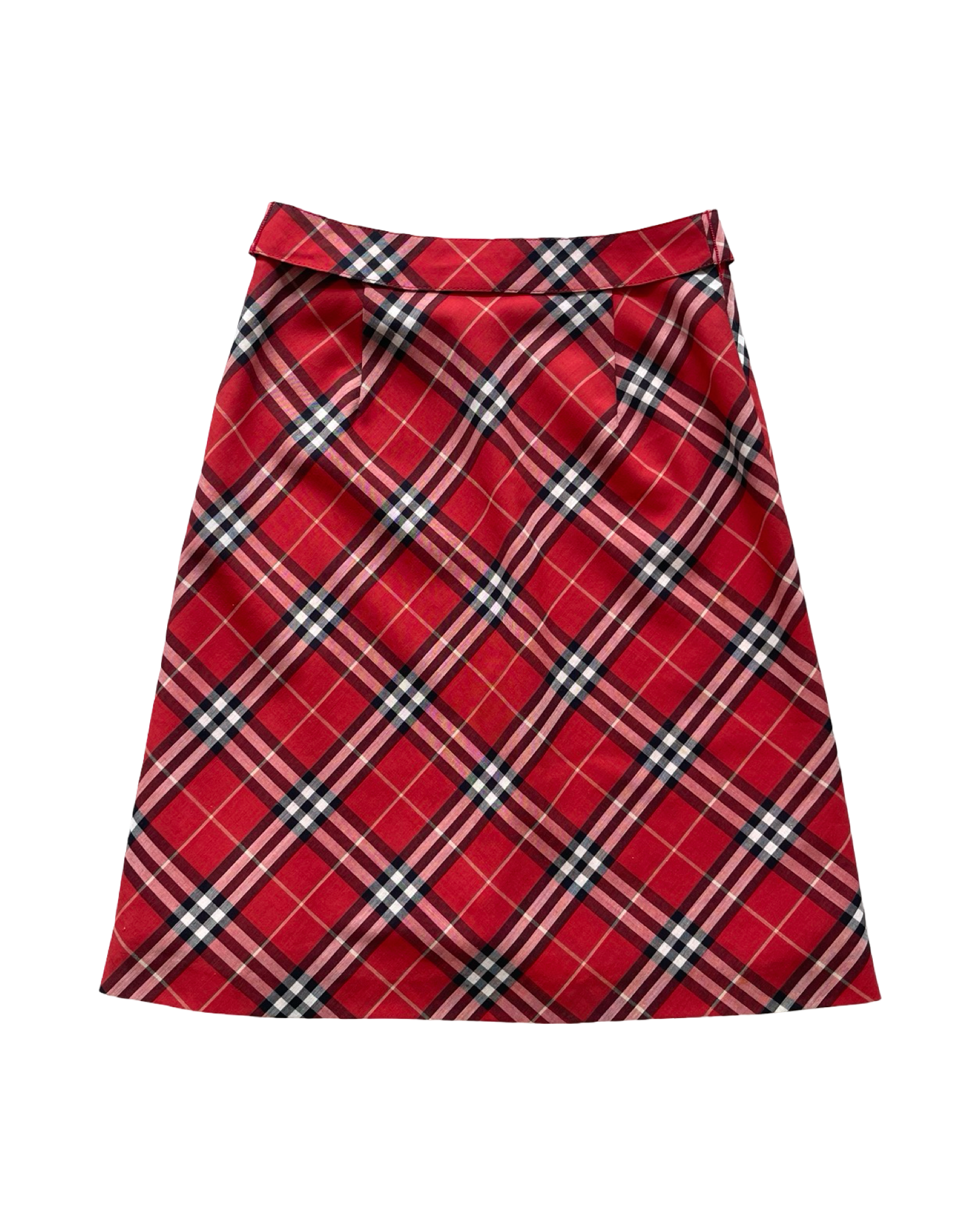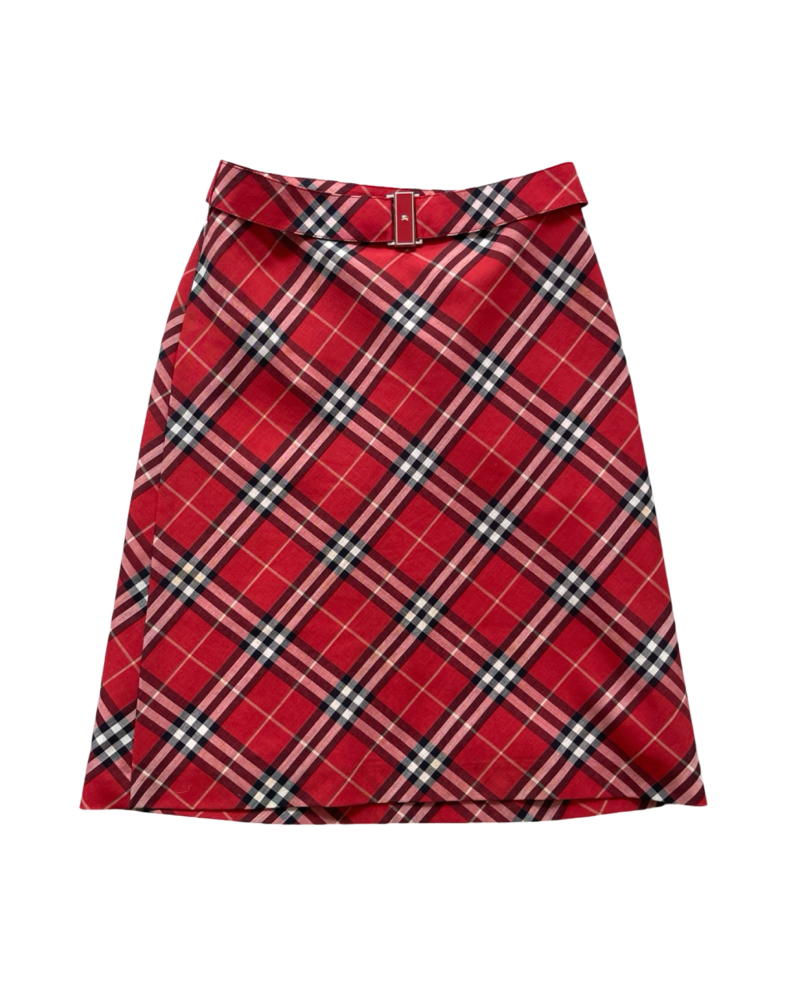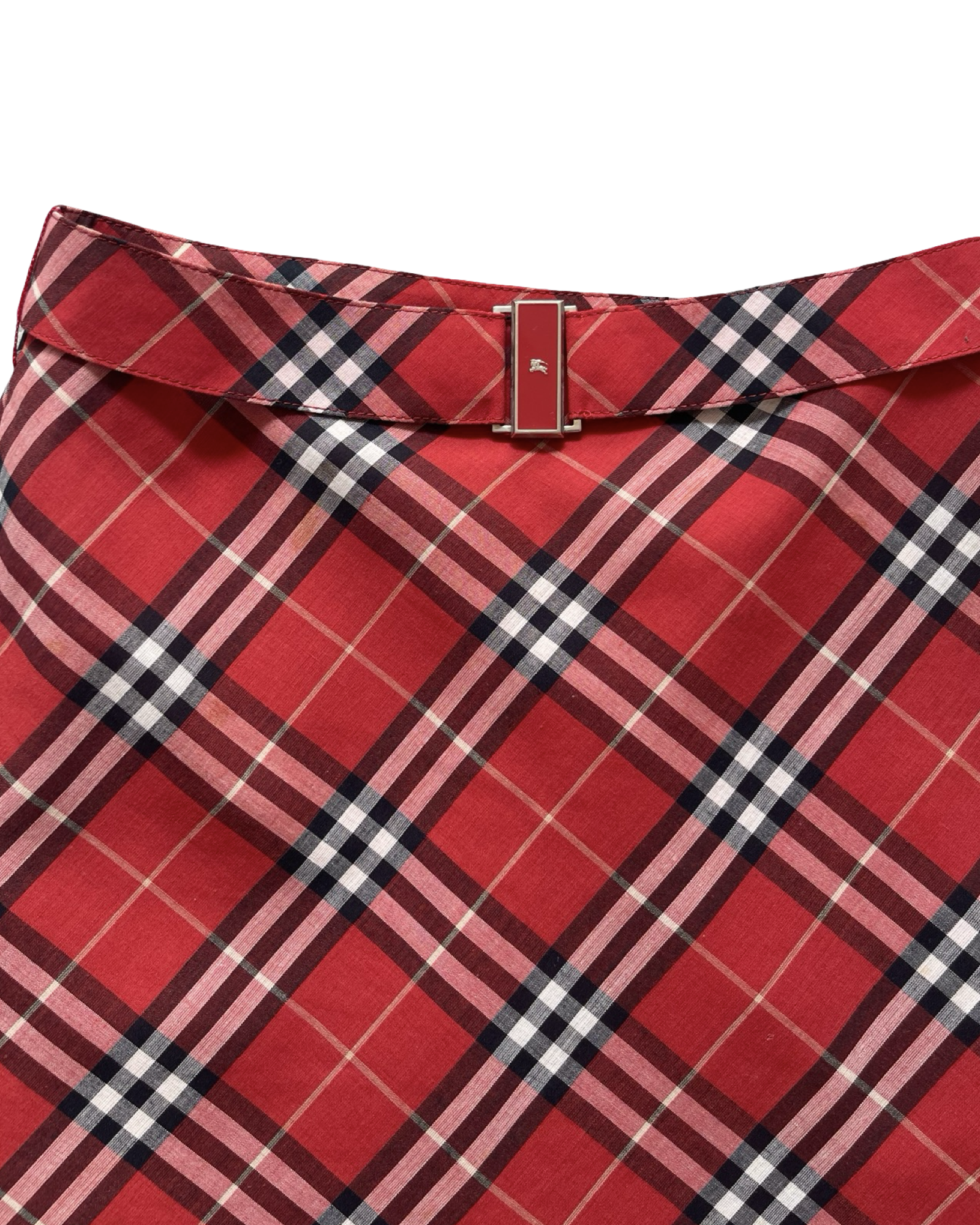 Burberry Blue Label red nova check high waist midi skirt with removable belt detail. Silver and red hardware on the buckle. Will fit smaller sizes low waisted.