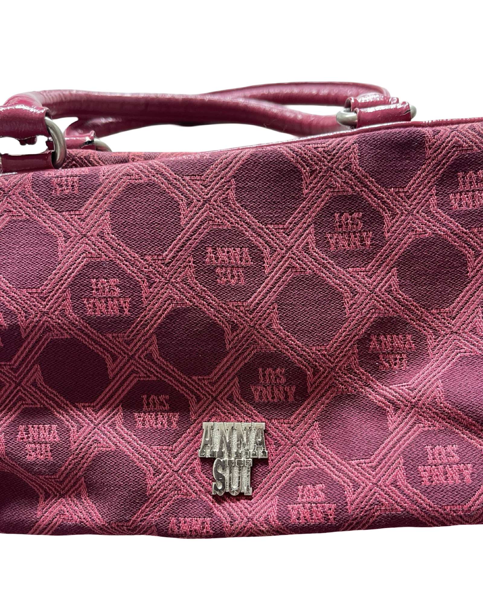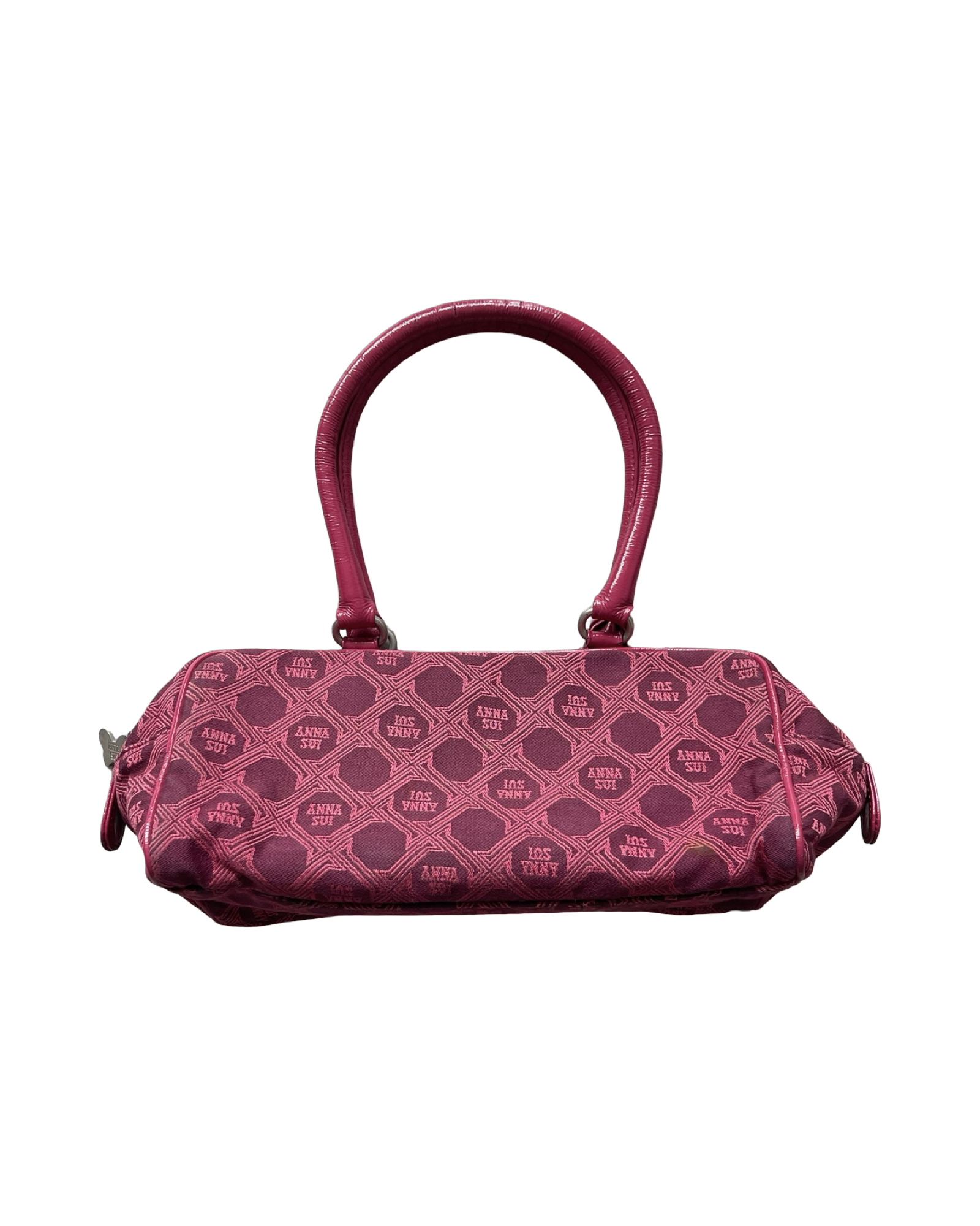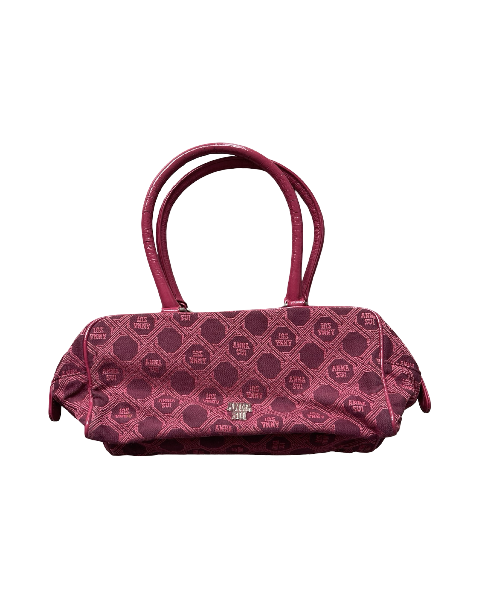 Dark red Anna Sui monogram shoulder bag with red leather details and silver hardware. Features a butterfly zip and inside zip pocket.