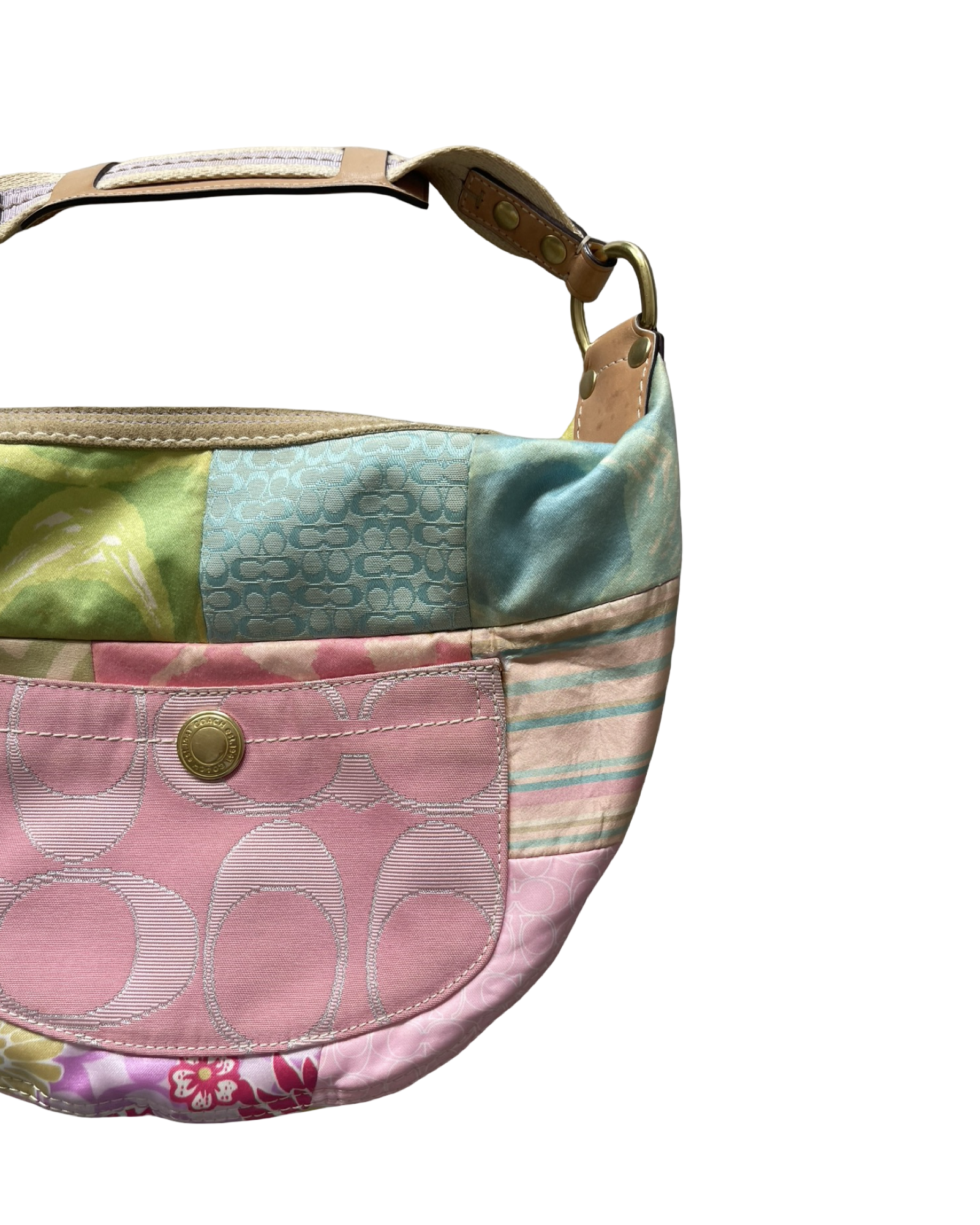 Vintage 2005 Coach monogram shoulder bag with patchwork style design with different patterns and colours. With brown leather strap and gold hardware.
