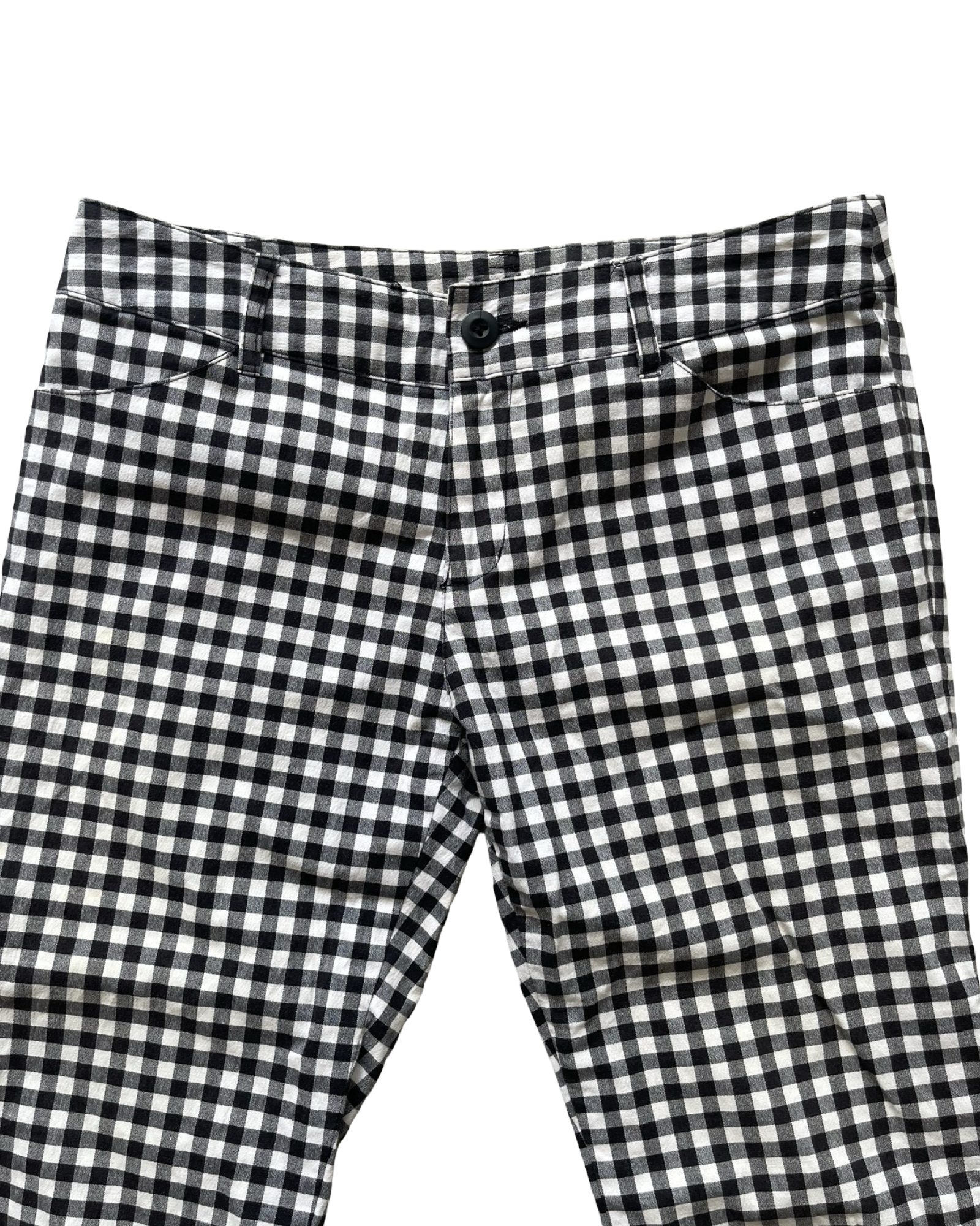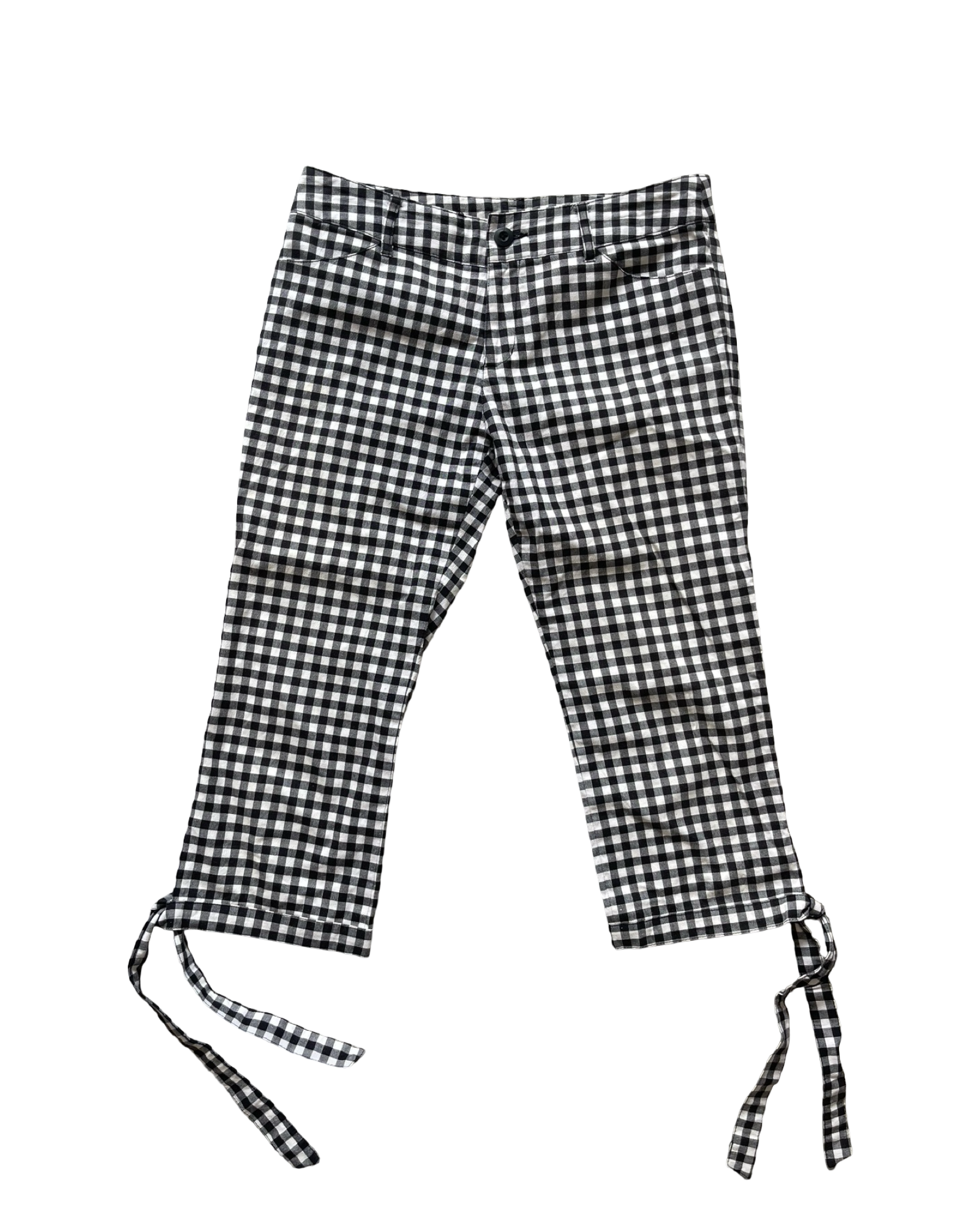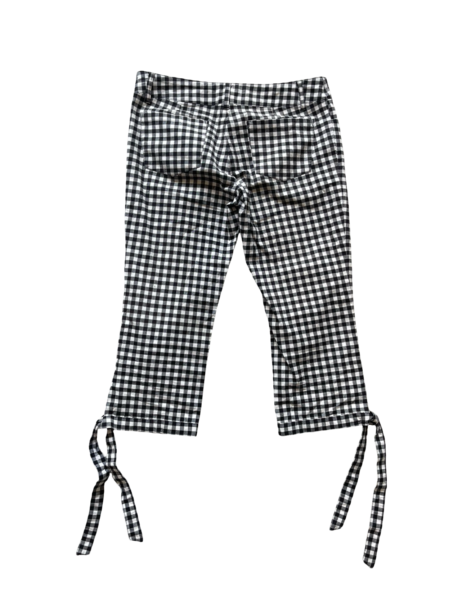 Black and white gingham low waisted capris with key hole tie up detail on the hem.