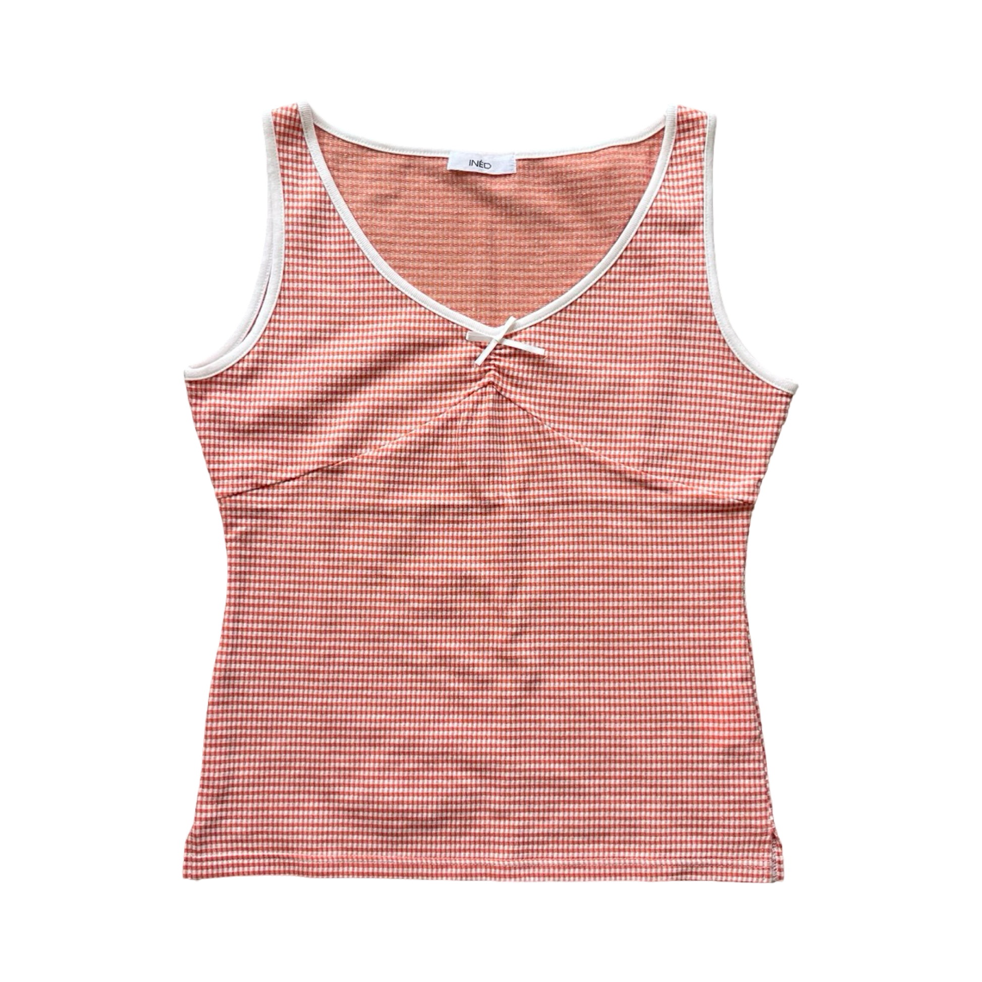 Orange and white gingham vest top with white trim and bow detail. Can fit a few sizes as the material is very stretchy.