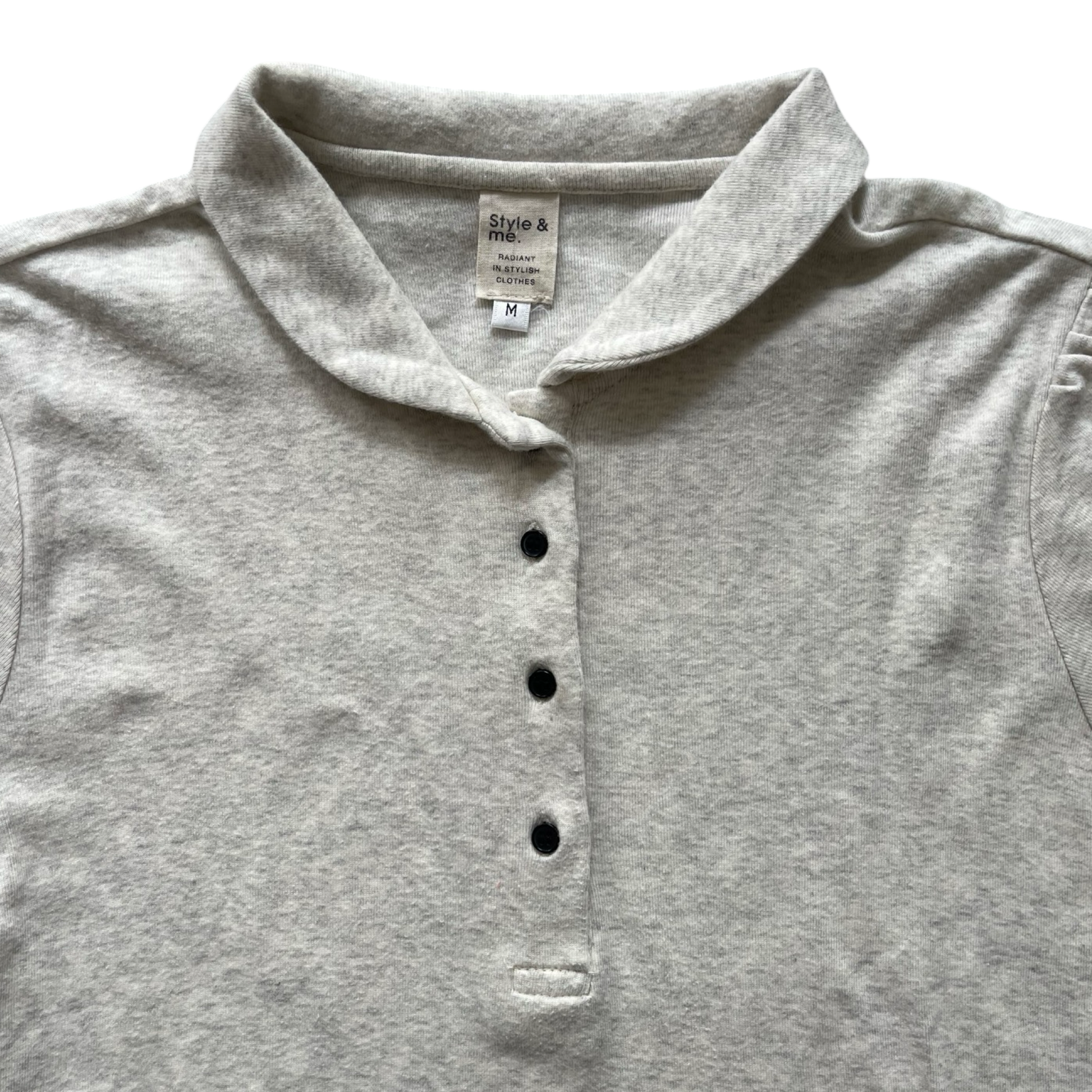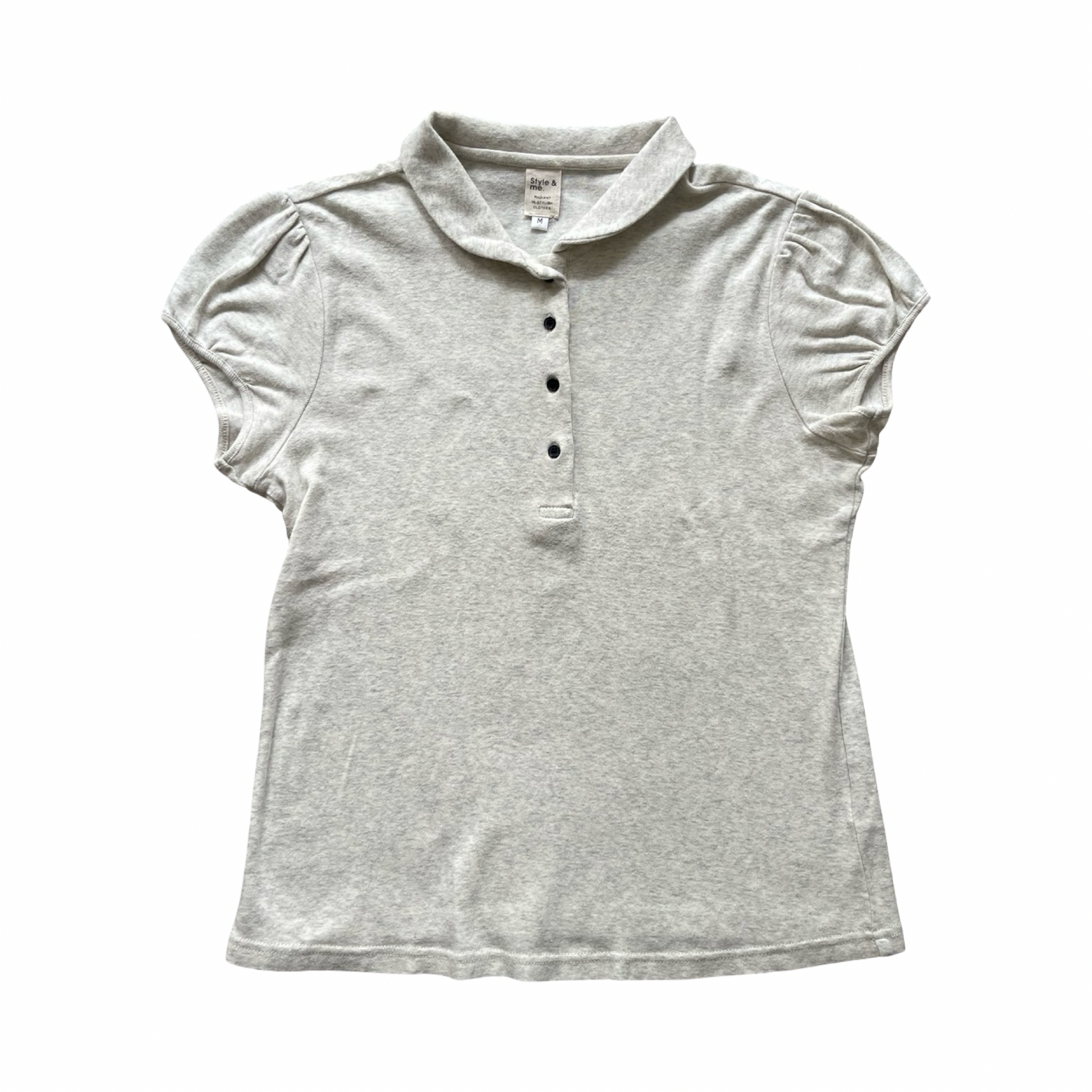 Light grey marl jersey polo shirt with short puff sleeves and a rounded collar. Made of super soft jersey material.