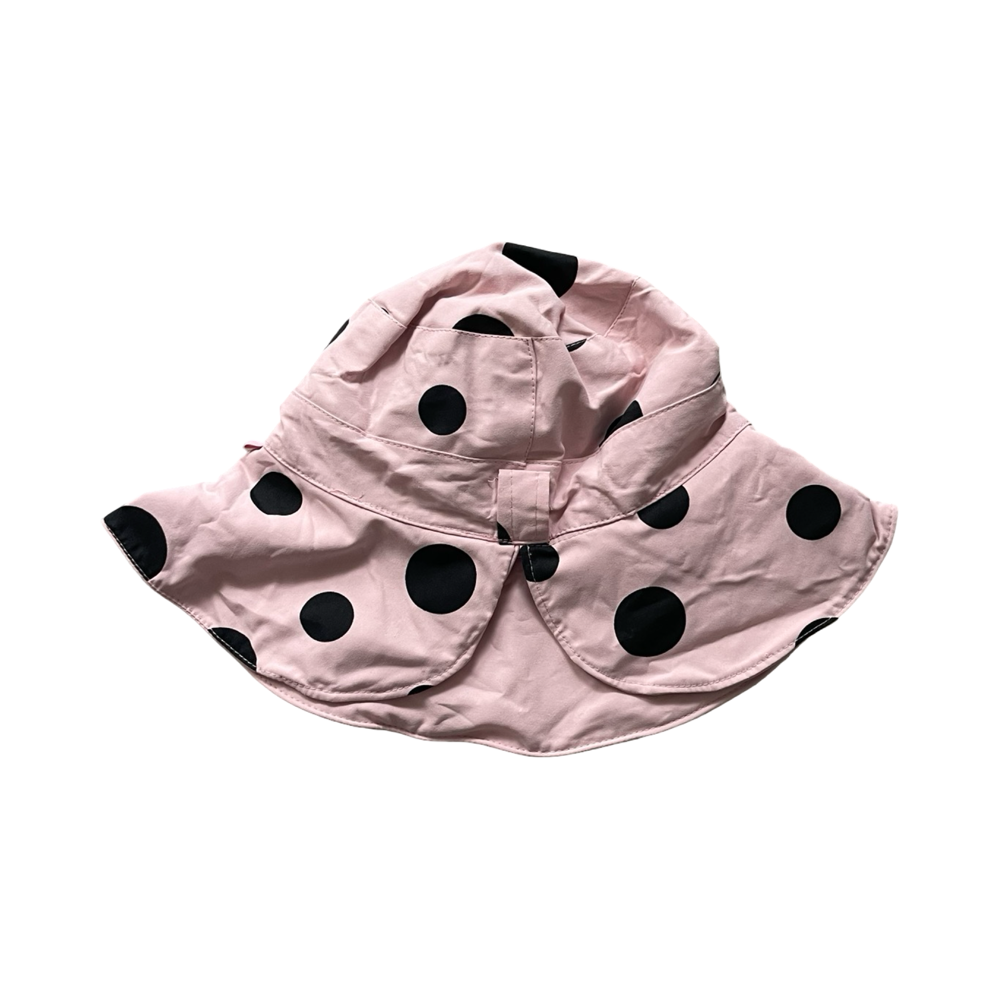 Pink and black polka dot bucket hat, with removable tie. The bucket has is reversible, so you can have polka dots all over or just on the middle. The brim of the hat is wired so you can wear it however you like and it will stay.