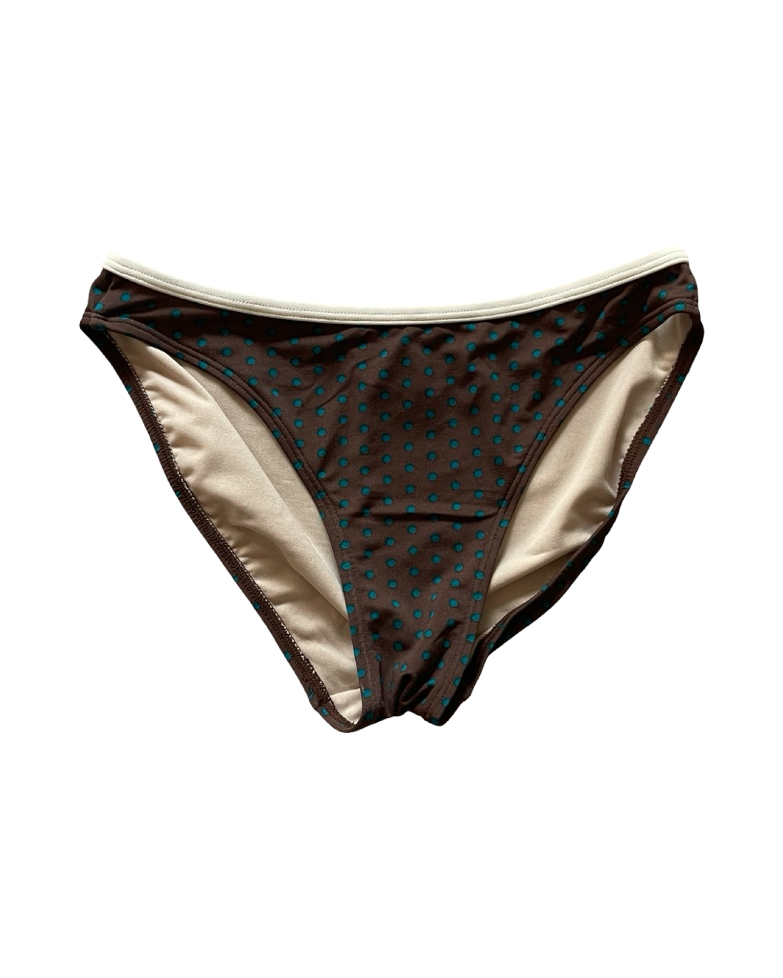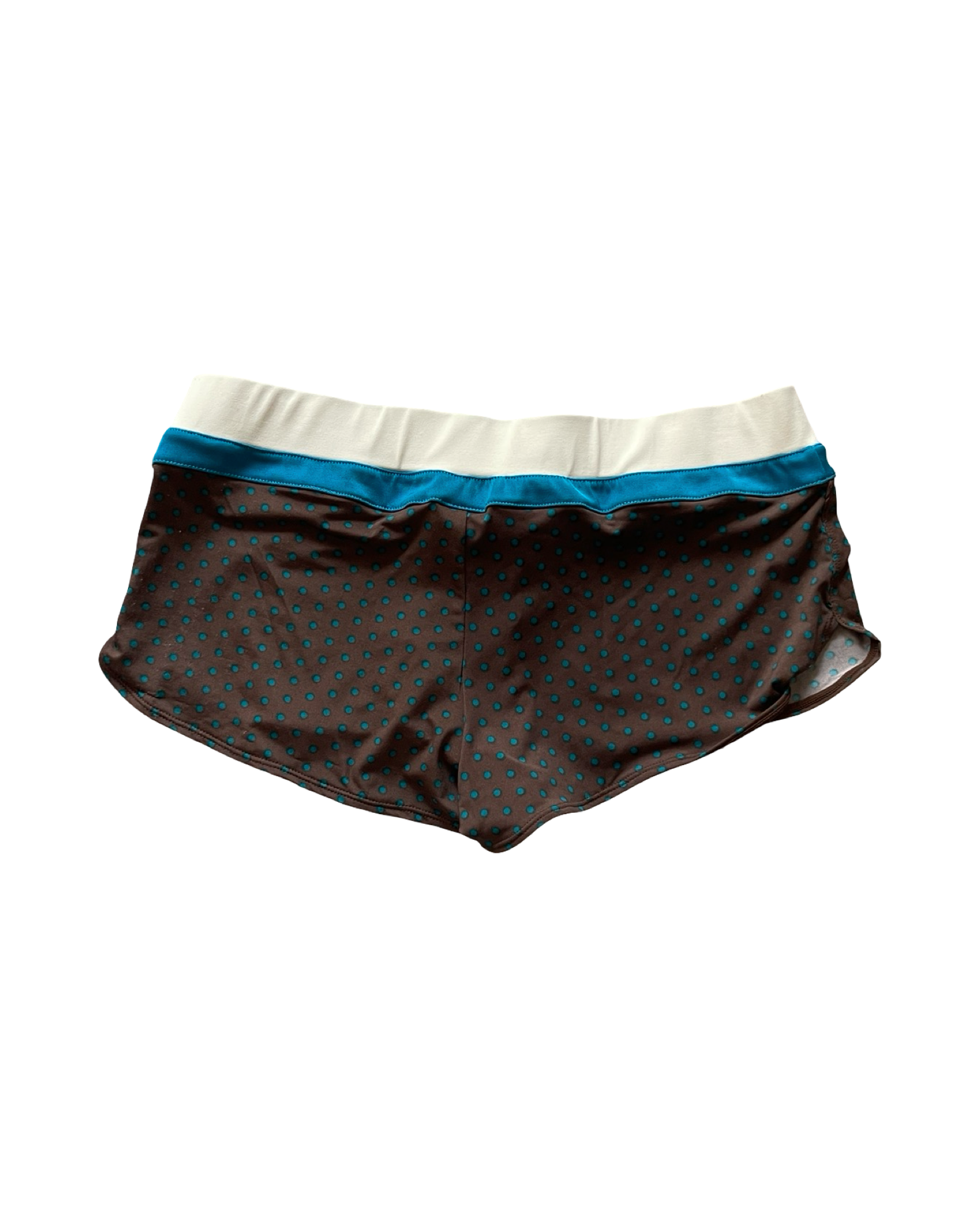 Brown and blue polka dot bikini set with shorts. Halter top with tie up and an adjustable back with clasp closure and removable pads. Two bottom options, classic pant or mini shorts with tie detail.