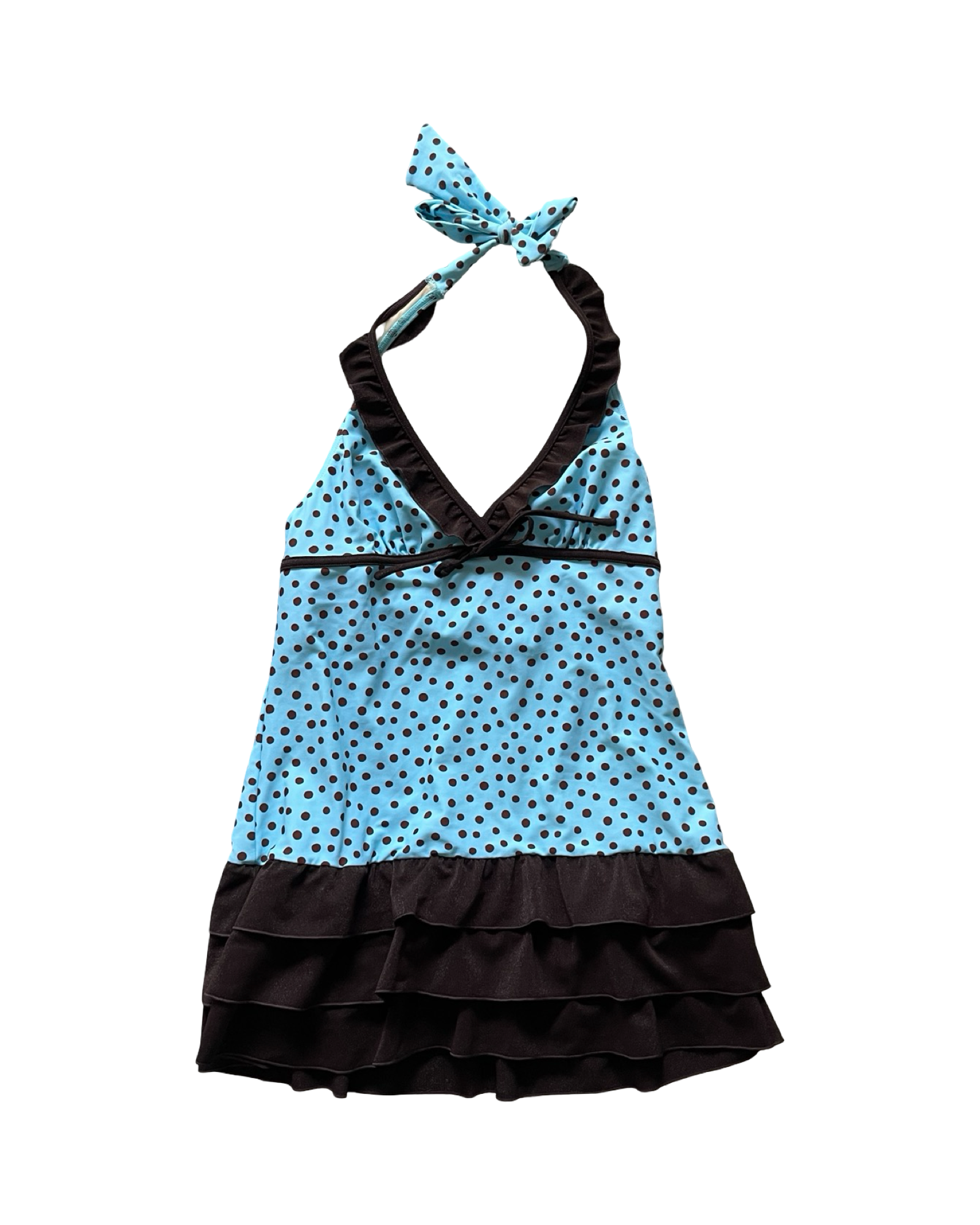 Blue and brown polka dot 3 piece swim set. Made up of a mini halter dress, with ruffle details along the neck and skirt and a tie detail across the bust. The dress is super stretchy, so will fit a range of sizes.