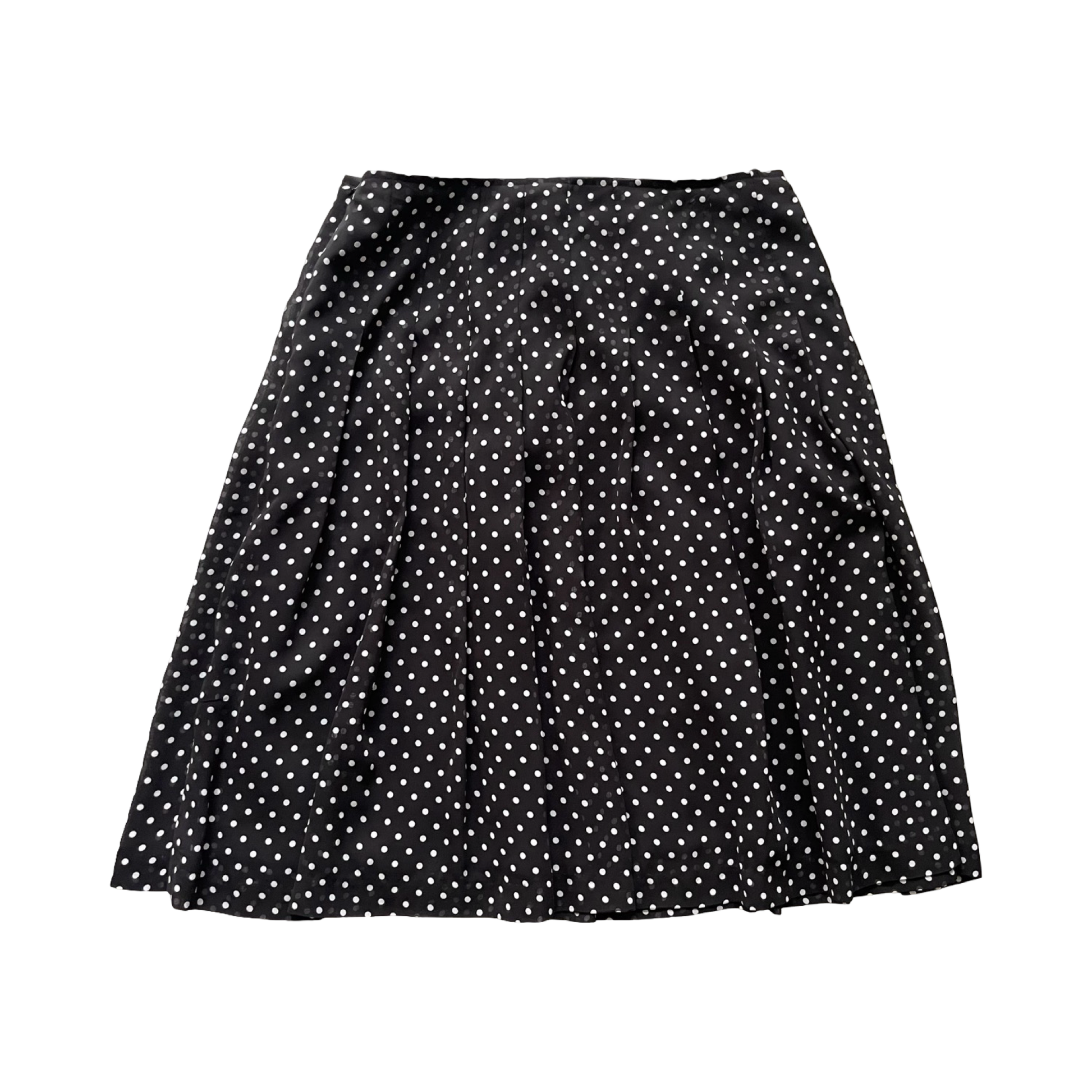 Black and white polka dot chiffon layered midi skirt with pleats and size zip.